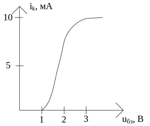 3 На вход усилителя подаётся напряжение uвх(t) = (1+cos10t) B. Проходная ВАХ транзистора известна. Построить график тока ik(ⱷt).