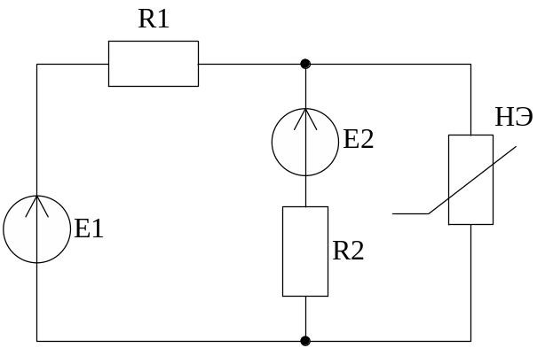 2 R1 = 1 кОм, R2 = 1 кОм, E1 = 2 В, E2 = 3 В. ВАХ нелинейного элемента известна. Рассчитать ток, протекающий через НЭ.