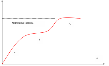 Как мы знаем из курса “Сопротивление материалов” при небольших нагрузках материал испытывает небольшие деформации, которые пропорциональны напряжениям: закон Гука (область а). При дальнейшем увеличении напряжений происходит пластическая деформация материала (область б), при дальнейшем увеличении нагрузок происходит разрушение (область с). Качественный вид зависимости напряжение (нагрузка) – деформация приведён на рисунке ниже.