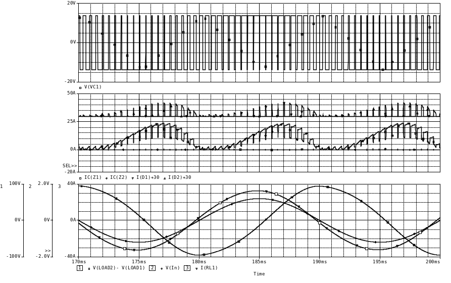 С помощью выключателей величина сопротивления нагрузки ступенчато по времени изменяется (уменьшается) сначала в два раза, затем в три раза. Обратите внимание, что величина тока через нагрузочный резистор при этом не зависит от величины сопротивления (нижний график). Напряжение на нагрузке соответствует закону Ома (верхний график).