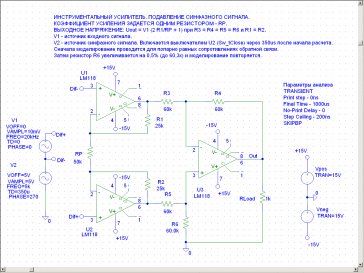 Убедитесь, что при соблюдении попарного равенства резисторов обратной связи синфазный сигнал не оказывает влияния на выходной сигнал. Посчитайте коэффициент усиления усилителя и проверьте его соответствие с моделированием.