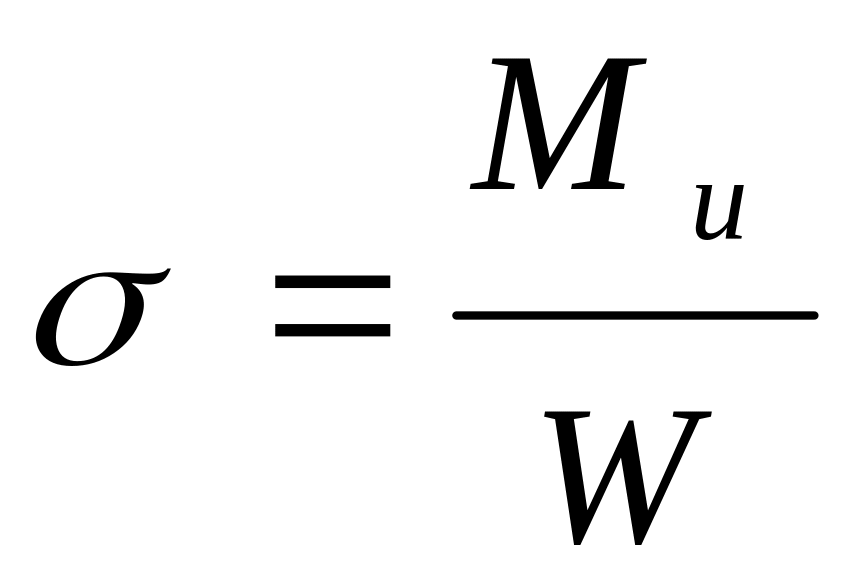 От изгибающего момента в сечении возникают только нормальные напряжения , измеряемые в МПа, которые неравномерно распределяются по сечению: максимальные напряжения возникают на верхних и нижних волокнах балки, а на оси балки напряжения равны нулю. Нормальные напряжения определяют по формуле: