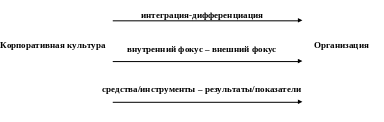 - внутренний фокус — внешний фокус: данное измерение отражает преобладание в организации интереса либо к устройству ее внутренних дел (скоординированность и удовлетворенность работников), либо к укреплению положения организации как целого во внешней среде;
