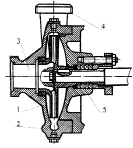 Конструктивное оформление простейшего центробежного насоса показано на рис. 6. Рабочее колесо насоса 1 помещено в корпус 2, имеющий камеру всасывания 3 и нагнетательный патрубок 4. Для уплотнения вала насоса в корпусе, с целью предотвращения утечек перекачиваемой жидкости, устанавливается сальник 5, конструкция которого определяется давлением в насосе, частотой вращения вала рабочего колеса, видом перекачиваемой жидкости (агрессивность, содержание твёрдых примесей, температура и т.п.).