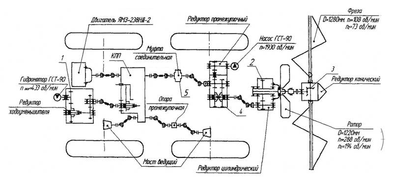 Кинематическая схема снегоочистителя К-703-ОС-Т 1. Ходоуменьшитель ОС-02.01.000 2. Редуктор цилиндрический ОС-03.06.000-1 3. Редуктор конический ОС-03.07.000-1 4. Редуктор промежуточный ОС-05.02.000 5. Муфта МОМ 2256010-42.30.000Т