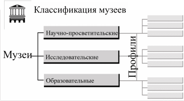 Музеи делятся: на научно-просветительные; исследовательские и учебные (рис. 1.). Профиль музея определяется в зависимости от характера экспонатов. Бывают художественные, литературные, естественно-научные, исторические, театральные, музыкальные, этнографические, промышленные и др.