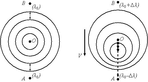 Предположим, что источник, расположенный в т. О, испускает свет длиной волны λ0. Наблюдатели в точках А и В, для которых источник света находится в покое, зафиксируют излучение с длиной волны λ0 (см. рисунок 1). Если источник света начинает двигаться со скоростью V, то длина волны меняется. Для наблюдателя А, к которому источник света приближается, длина световой волны уменьшается. Для наблюдателя В, от которого источник света удаляется, длина световой волны увеличивается (см. рисунок 2). Так как в видимой части электромагнитного излучения наименьшим длинам волн соответствует фиолетовый свет, а наибольшим – красный, то говорят, что для приближающегося источника света наблюдается смещение длины волны в фиолетовую сторону спектра, а для удаляющегося источника света – в красную сторону спектра.