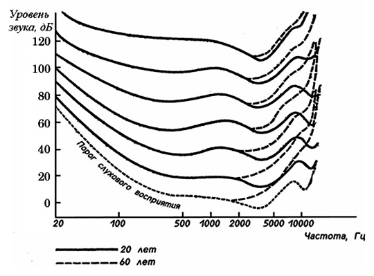 Самый низкий тон, воспринимаемый человеком с нормальным слухом, имеет частоту около 20 Гц. Верхний предел слухового восприятия сильно различается у разных людей. Особое значение здесь имеет возраст. В восемнадцать лет при безупречном слухе можно услышать звук до 20 кГц, но в среднем границы слышимости для любого возраста лежат в интервале 18 — 16 кГц. С возрастом чувствительность человеческого уха к высокочастотным звукам постепенно падает. На рисунке приведен график зависимости уровня восприятия звука от частоты для людей разного возраста.