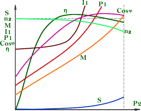 ТокI1, потребляемый двигателем из сети, неравномерно изменяется с увеличением нагрузки на валу двигателя. При холостом ходе cos мал и ток имеет большую реактивную составляющую. При малых нагрузках на валу двигателя активная составляющая статора меньше реактивной составляющей, поэтому активная составляющая тока незначительно влияет на ток I1, определяющийся в основном реактивной составляющей. При больших нагрузках активная составляющая тока статора становится больше реактивной и изменение нагрузки вызывает большое изменение тока I1. Графически зависимость потребляемой двигателем мощности Р1 выражается прямой линией, незначительно отклоняющейся вверх от прямой при больших нагрузках, что объясняется увеличением потерь в обмотках статора и ротора с возрастанием нагрузки. Коэффициент мощности изменяется в зависимости от нагрузки на валу двигателя следующим образом. При холостом ходе cos мал (порядка 0,2), так как активная составляющая тока статора обусловленная потерями мощности в машине, мала по сравнению с реактивной составляющей этого тока, создающей магнитный поток. При увеличении нагрузки на валу cos возрастает (достигая наибольшего значения 0,8—0,95) в результате увеличения активной составляющей тока статора. При очень больших нагрузках происходит некоторое уменьшение cos , так как вследствие значительного увеличения скольжения и частоты тока в роторе возрастает реактивное сопротивление обмотки ротора. Кривая кпд имеет такой же вид, как в любой машине или трансформаторе. При холостом ходе кпд равен нулю. С увеличением нагрузки на валу двигателя кпд резко увеличивается, а затем уменьшается. Наибольшего значения кпд достигает при такой нагрузке, когда потери мощности в стали и механические потери, не зависящие от нагрузки, равны потерям мощности в обмотках статора и ротора, зависящим от нагрузки.