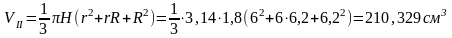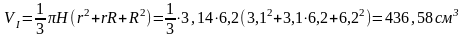 Қақпақ бөлшегінің көлемі қиық конустың көлемінен цилиндр көлемін алғандағы мәнге тең. Ол келесі формула бойынша анықталады: