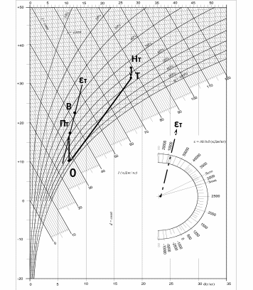 3. Из точки 0 оС на оси ординат I-d-диаграммы проводится луч процесса к соответствующему значению εт и параллельно переносится на точку В. Значения εт нанесены по контуру I-d-диаграммы. На некоторых диаграммах значения εт представлены в виде транспортира в нижней части диаграммы. Луч процесса εт показывает направление изменения состояния воздуха в помещении под воздействием тепло- и влагопритоков.
