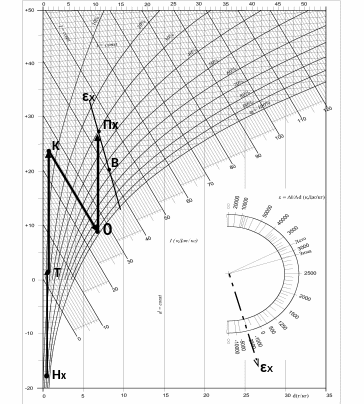 14. Через точку В проводится луч процесса изменения состояния воздуха в помещении с тепловлажностным коэффициентом εх и по нему откладывается ∆Iрабх от точки В вверх, если теплоприток Qх отрицательный, или вниз, если теплоприток Qх положительный. Полученная точка Пх отражает состояние воздуха, который будет подаваться в помещение после обработки в системе кондиционирования (приточный воздух).
