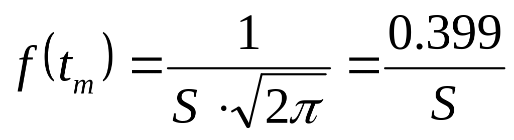 Кривая плотности распределения нормального закона тем острее и выше, чем меньше S. Она начинается от t =-∞ и распространяется до t =+∞. Площадь, очерченная уходящими в бесконечность ветвями кривой плотности, выражающая соответствующую вероятность отказов, очень мала. Так, вероятность отказа за период времени до tm-3S составляет всего 0,135% и обычно в расчетах не учитывается. Вероятность отказа до tm-2S равна 2,175%. Наибольшая ордината кривой плотности распределения нормального закона равна