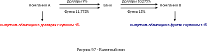 Банк получает от В ставку 10,275% в долларах и уплачивает 9% в долларах компании А. От А он получает 11,775% в фунтах и уплачивает 13% в фунтах компании В. Таким образом, банк выигрывает по долларам:10,275% - 9% = 1,275%.