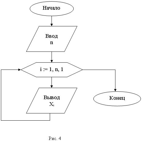 Например, выведем одномерный массив Х1, Х2, …, Хn, состоящий из элементов вещественного типа, используя цикл с параметром (Рисунок 4):