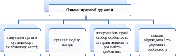 В даний час прийнято виділяти чотири основних ознаки правової держави (див. схему).