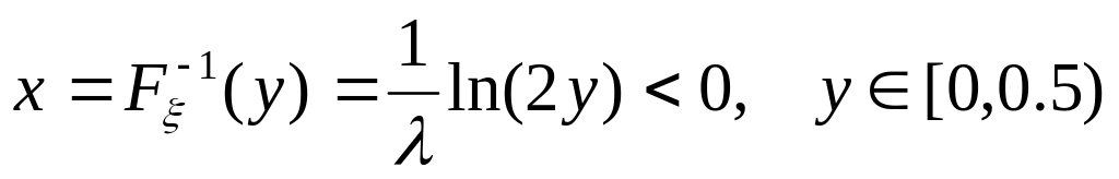 Принимается решение о том, что реализацией СВ является величина x, вычисляемая по формуле (29), если y<0.5; но формуле (30), если