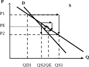 Если в силу каких-либо причин цена отклонилась от первоначального равновесия, то возникает вопрос: вернется ли рынок с течением времени к первоначальному состоянию равновесия в точке Е, примет ли цена первоначальное значение или этого не произойдет и равновесие установится на новом уровне. В зависимости от ответа на этот вопрос рассматривается необходимость вмешательства или невмешательства государства в экономику.