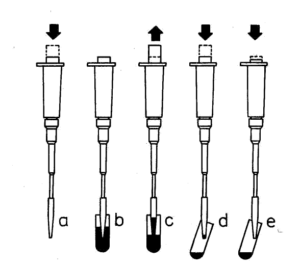 Перемещение кнопки пипетки при наполнении и опорожнении наконечника должно осуществляться плавно и медленно.