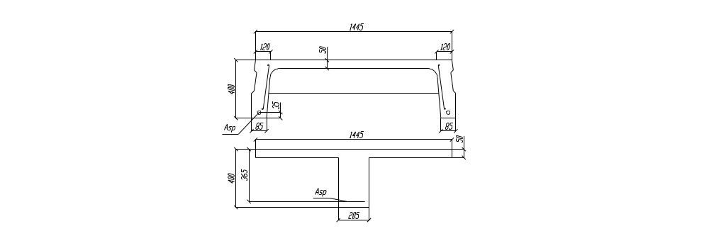 Подбор арматуры продольного ребра выполняем как для изгибаемого элемента таврового профиля высотой h = 400 мм и фактической шириной bf = 1445 мм.