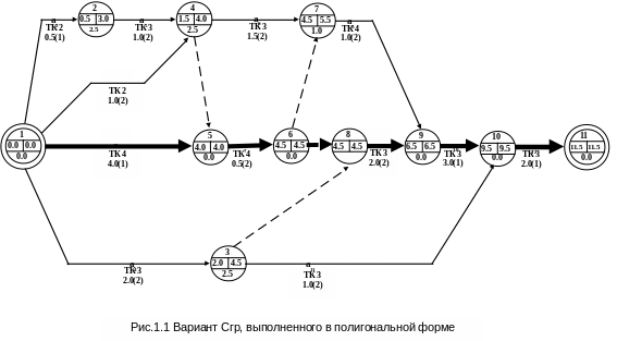 Полный путь максимальной продолжительности называется критическим путем и обозначается как [Lкр]. В сети может быть несколько критических путей (в принципе, количество критических путей может быть равно числу полных путей), которые изображаются либо утолщенными, либо двойными линиями, либо выделяются цветом. На Сгр (см. рис. 1.1) критическим путем является путь, проходящий через события 1,5,6,8,9,10,11.