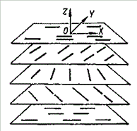 Найскладніший тип упорядкування для холестеричних рідких кристалів, що характеризуються сполученням паралельних нематичних шарів. Напрям осей молекул у кожному з наступних шарів повернутий на певний кут відносно напрямів цих осей у попередніх шарах. Для таких систем ρ=const, а L модульовано за напрямом так, що кінці векторів Lутворюють гвинтову лінію у вигляді спіралі з певним кроком (рис. 5). У площині XOY холестерині рідкі кристали мають таку ж плинність. Як і нематичні рідкі кристали. А вздовж осі OZ їхні механічні властивості подібні до властивостей смектичних рідких кристалів. Внаслідок такого упорядкування холестерині рідкі кристали мають унікальні оптичні властивості.