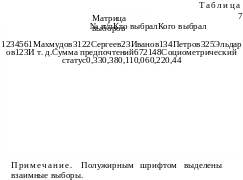 кам вписывают фамилии (или шифры) опрошенных, а в колонках — номера, под которыми записаны эти фамилии. В каждой строчке проставляют предпочтения в выборе. При этом взаимные выборы выделяют (контрастным цветом, обводят в кружок и т.д. — в таблице они отмечены полужирным шрифтом). В качестве примера приведены пары Махмудов —Сергеев, Махмудов — Эльда-ров. В двух нижних строчках подсчитывают абсолютную сумму предпочтений и социометрический статус (иногда его называют индексом популярности), который высчитывается по формуле 5 = К/3(N - 1), где Я — количество баллов, К/3 —рейтинг, N — количество опрошенных.