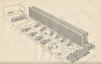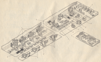 Рис.3.8 [12], на втором этаже - ГАЦ сборки. Первый и второй этаж объединены общим высотным автоматизированным складом (поз.1). Перемещение объектов производства выполняют индуктивные тележки. Затраты на создание завода составили 37 млн. долларов. Обслуживающий персонал – 60 человек. На ГАЗ