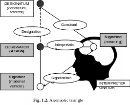 The relations between the designatum, designator, signifier and signified is conventionally demonstrated with the ‘semiotic triangle’ model proposed by Charles Ogden and Ivor Richards in 1923. This model, which develops the earlier ideas of Ferdinand de Saussure (1857-1913) and Charles Pierce (1839-1914), the founders of semiotics, exists in its various versions, all of which attempt to show how a sign is related to the experienced entity which it represents. Later, the model was supplied with one more constituent – ‘the interpreter’ (concepualizer) described in detail by Charles Morris (1901-1979) who applied this term to an organism for which something is a sign. Below, is one more version of the ‘semiotic triangle’ (Fig. 1.2) which helps to account for the interaction between the constituents of semiosis.