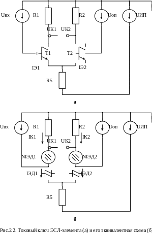 - функциональная гибкость, ЭСЛ-элемент формирует на двух своих выходах одновременно прямую и инверсную логическую функцию;