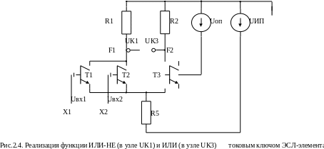Типовой вариант электрической схемы ЭСЛ-элемента (рис.2.1) состоит из переключателя тока (транзисторы T1, Т2, Т3) и двух эмиттерных повторителей (транзисторы Т4, Т5). Логическая функция, реализуемая ЭСЛ-элементом, в данной схеме формируется токовым ключом, а эмиттерные повторители выполняют вспомогательную функцию согласования логических уровней и увеличения нагрузочной способности.