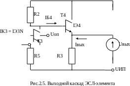 Выходную характеристику можно получить для любого из выходов ЭСЛ-элемента (см. рис.2.1). Для второго выхода (рис.2.5) по первому правилу Кирхгофа