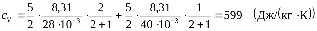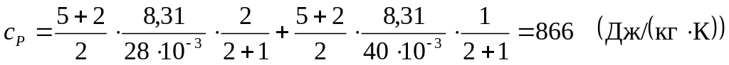 где i – число степеней свободы (для двухатомного газа (азот) i=5, для одноатомного (аргон) i=3); R=8,31 - универсальная газовая постоянная; М1 = 28×10-3 кг/моль – молярная масса азота; М2 = 40×10-3 кг/моль – молярная масса аргона.