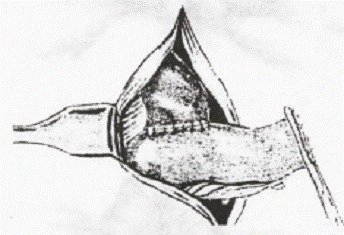У разі необхідності операції в умовах реактивної або токсичної стадії перитоніту перевагу слід віддавати тонкокишковому анастомозу „бік у бік" (Рис. 15.) з обов'язковою інтубацією кишечнику. Операцією вибору в такої категорії хворих є накладення У-подібного анастомозу „кінець у бік" за Майдлем з виведенням декомпресійної ентеростоми (Рис. 16.).