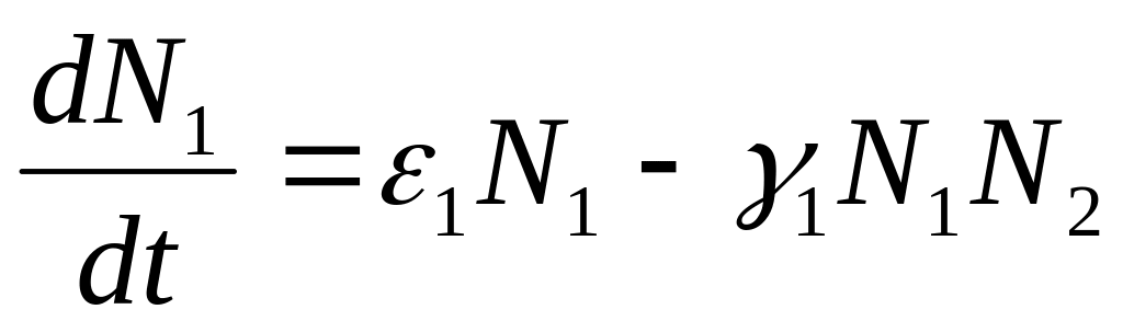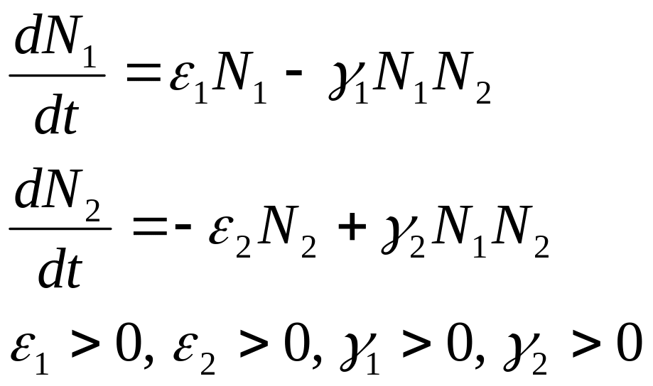Рассмотрим некоторый ограниченный ареал, в котором обитают два вида. Пусть и N2(t)—их численности.