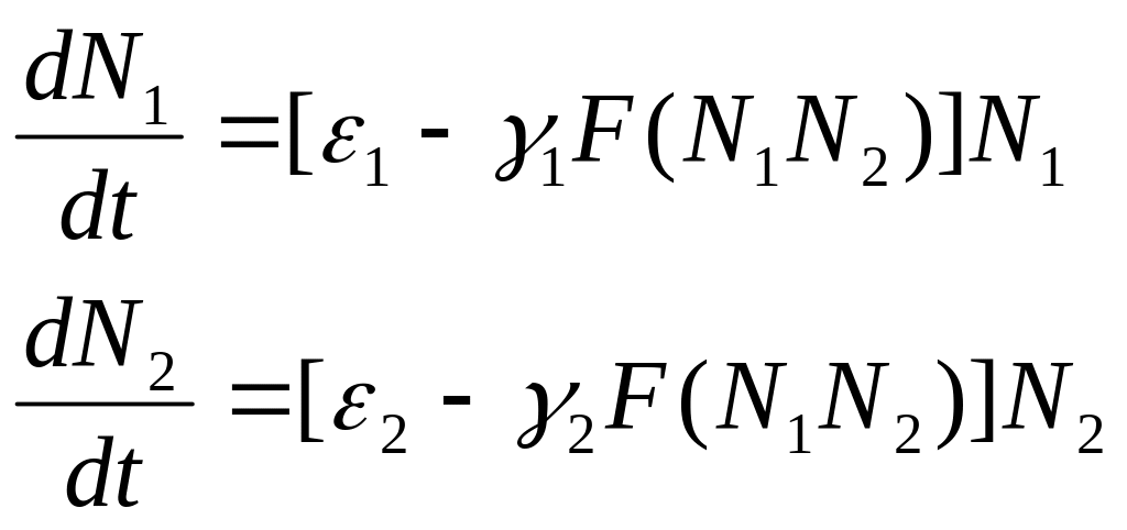 Так как запасы пищи не безграничны, то выедание ее приведет к голоданию и, это естественно предположить, к уменьшению скоростей роста популяций. Пусть F( , N2)—количество пищи, съедаемой представителями обоих видов за единицу времени. Характер этой функции ясен. Она должна стремиться к плюс бесконечности при неограниченном росте хотя бы одного аргумента и стремиться к нулю, когда оба аргумента стремятся к нулю.
