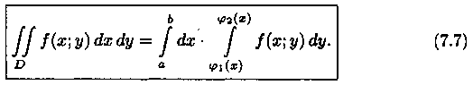 Формула (7.7) представляет собой способ вычисления двойного интеграла в декартовых координатах. Правую часть формулы (7.7) называют двукратным (или повторным) интегралом от функции ƒ(х; у) по области D.