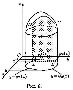 В сечении получим криволинейную трапецию ABCD, ограниченную линиями z=ƒ(х;у), где х=const, z=0, у=1(x) и у=2(х) (см. рис. 8). Площадь S(х) этой трапеции находим с помощью определенного интеграла