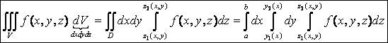 Тогда тройной интеграл сводится сначала к двойному, а затем к трёхкратному с учётом того, что в декартовых координатах dV = dxdydz;