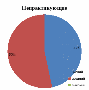 Низкие баллы по шкале ОО свидетельствуют о том, что респондент не испытывает болезненного переживания одиночества, связанного с нехваткой близости или общения, и не считает себя одиноким человеком. Среди практикующих процент людей с низким уровнем переживания одиночества почти вдвое больше: 80% и 47%. Для группы непрактикующих характерен средний уровень общего переживания одиночества (53% испытуемых).