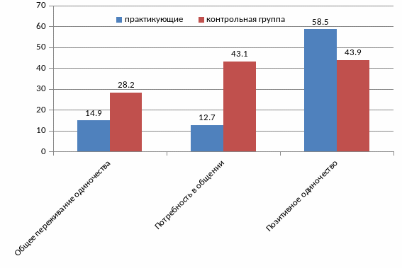 Средние значения по шкале общего переживания одиночества в группе практикующих и непрактикующих равны соответственно 15,8 и 29,9. Стандартное отклонение по этой шкале в группе практикующих минимально и равно 11, 8. Можно говорить о том, что выборка достаточно однородна по общему переживанию одиночества, которое невелико.
