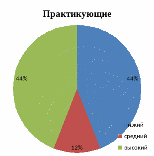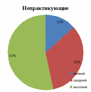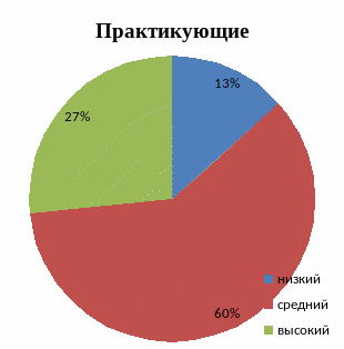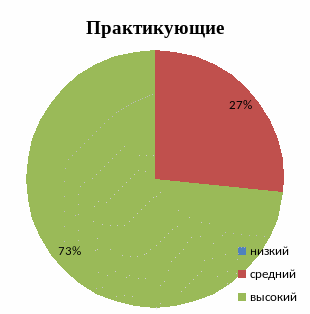 По результатам эмпирического исследования группа практикующих характеризуется более зрелыми религиозно-психологическими представлениями и установками. В отличие от группы непрактикующих здесь полностью отсутствуют низкие показатели индекса базовых духовных переживаний. Группа практикующих превосходит группу непрактикующих по количеству лиц с высокими показателями индекса: 73 и 53% (рис. 18).