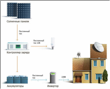 Все це має назву - автономна система енергопостачання на підставі сонячних батарей. У той же час в системі, яка працює на скидання енергії в громадську мережу, акумулятори та контролери не потрібні, потрібен тільки мережевий інвертор. [4]