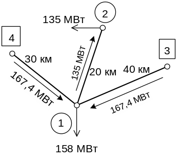 При выводе в ремонт линии 4-2 линия 3-2 должна обеспечить пропускную способность равную нагрузке в узле 2 (т.е. 135 МВт). И наоборот при выводе в ремонт линии 3-2 линия 4-2 должна обеспечить пропускную способность равную нагрузке в узле 2. Аналогично для линий 3-1 и 4-1.
