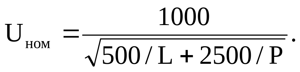 Номинальное напряжение сети существенно влияет на ее технико-экономические показатели и технические характеристики. Ориентировочно его можно определить по эмпирическим формулам, устанавливающим зависимость номинального напряжения от передаваемой мощности Р (МВт) на одну цепь и расстояния L (км), на которую она передается. С этой целью используются либо формула Стилла