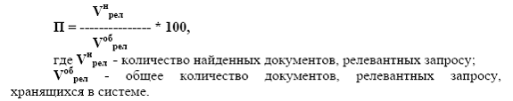 Полнота поиска (П) - дополнительный параметр, показывающий, какова доля (или процент) найденных релевантных документов в общем количестве релевантных документов, т.е. характеризуется соотношением между всей релевантной информацией, имеющейся в базе, и той ее частью, которая включена в ответ и рассчитывается по формуле: