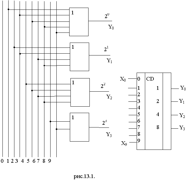 Шифратор - устройство, осуществляющее преобразование десятичных чисел в двоичную систему счисления. Пусть в шифраторе имеется m входов, последовательно пронумерованных десятичными числами (0, 1, 2, 3, ..., m - 1) и n выходов. Подача сигнала на один из входов приводит к появлению на выходах n- разрядного двоичного числа, соответствующего номеру возбужденного входа.