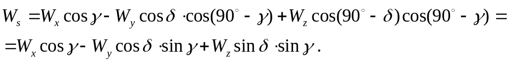 В системе координат x, y, z направление излучения S определяется углами γ0 и δ0 (рис. 2.4), где γ0 – угол между направлением продольной оси самолета 0x и направлением излучения S, δ0 – угол между обратным направлением вертикальной оси самолета 0y и проекцией Syz направления излучения S на плоскость y0z. Вектор полной скорости можно разложить в самолетной системе координат на три составляющие: Wx, Wy, Wz. Проектируя эти составляющие полной скорости на направление излучения S и суммируя их, получаем