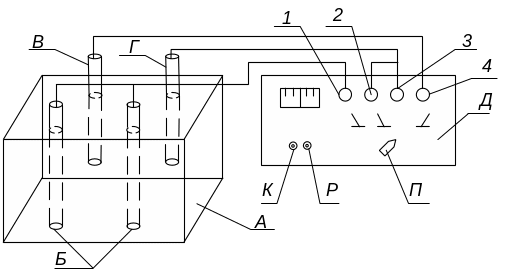 Установка состоит из бака А с проводящей средой, имитирующей землю, заземлителей Б, потенциального В и вспомогательного Г электродов и измерительного прибора Д типа М - 416. В качестве проводящей среды используется вода.
