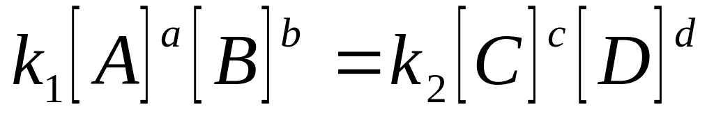 Po určité době soustava dospěje do stavu dynamické rovnováhy, kdy se rychlosti obou reakcí vyrovnají (v1 = v2). Koncentrace látek A, B, C a D se navenek nemění (mluvíme o rovnovážných koncentracích), ale obě reakce neustále probíhají.